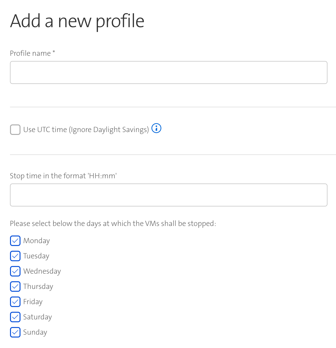 Start days: Select all days where the VMs having this profile shall be started at the specified start time.