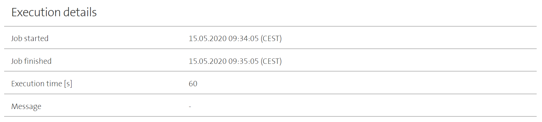 Jobs that have already been executed contain additional information regarding the execution right below the job details. This includes the exact time when the execution has been started as well as the time when the execution finished. Calculated based on these two values, the execution time is displayed as well. For jobs that have been skipped by either the system or the user, the start and finish time will be equal. For all other jobs, the start time represents the moment when the command was effectively sent to vRA. The finish time represents the time when the command execution was completed in vRA.
