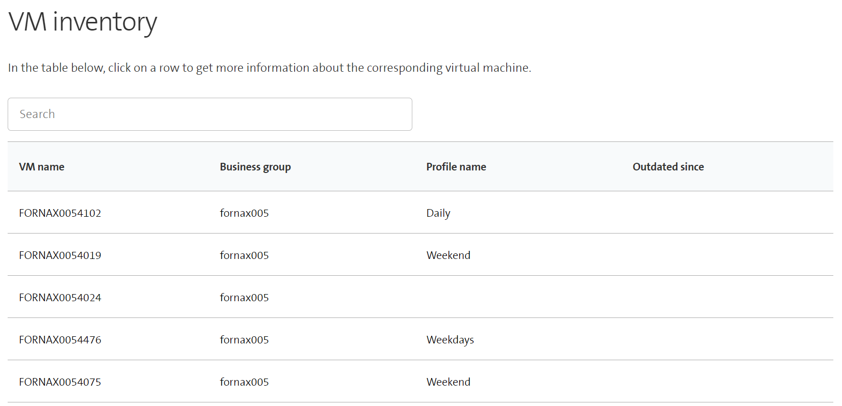 Additionally, a search field is provided that can be used to filter the table. The displayed table is updated dynamically, i.e. when the content of the search field changes, all VMs fulfilling the current criterion are displayed. Note that the search works for all fields, i.e., VM name, business group, profile, and date outdated.