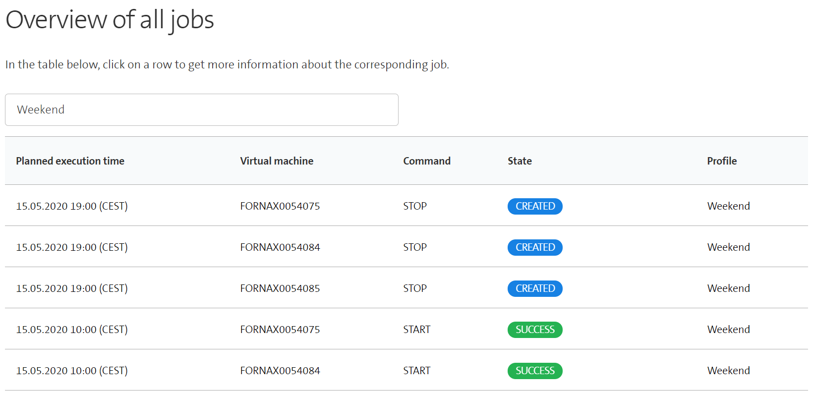 In all three job overviews, users can display details to a job by clicking on the corresponding table row. The displayed details encompass the VM name, the profile of the VM, the command (start or stop), the execution time, and the state of the job.