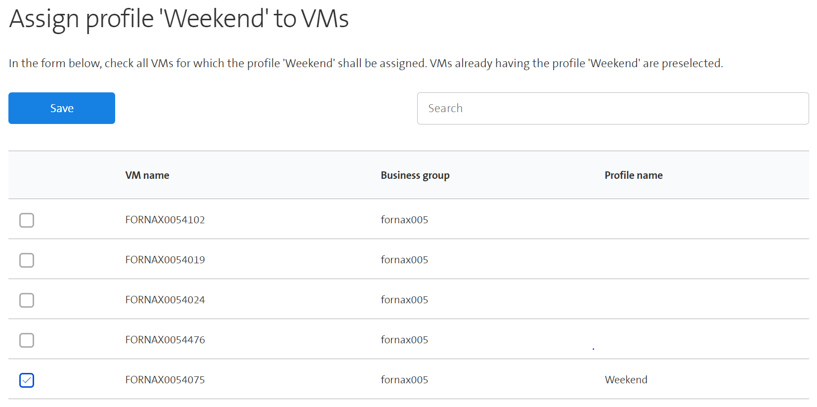 - Select all VMs for which the profile Weekend shall be assigned and click on Save.
