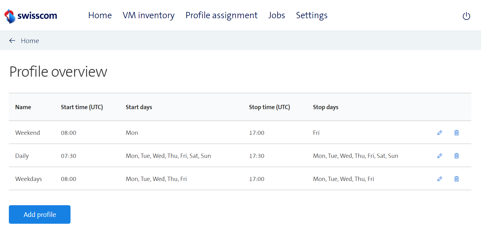For each profile, it is indicated at what time the VMs having this profile will be started and stopped and on which days these operations will happen. For example, VMs having the profile Weekdays will be started each day except on Saturday and Sunday at 8 o'clock. Similarly, all these VMs will be shut down on every day except on the weekend at 17 o'clock. On the other hand, VMs having the profile Weekend will only be stopped on Friday and then started again on Monday.