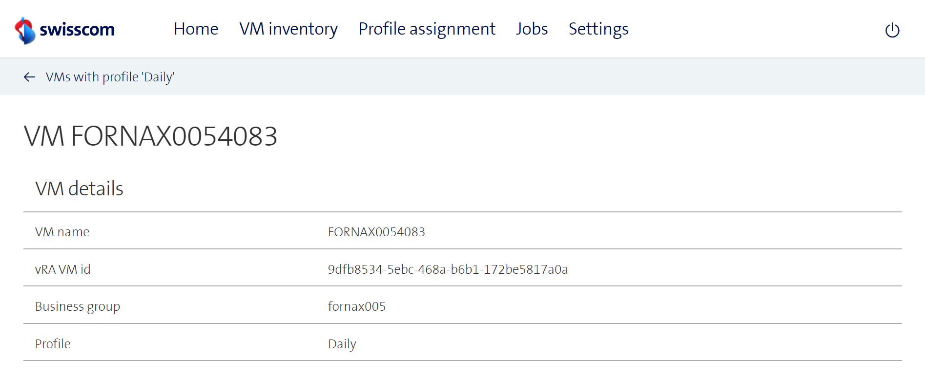 In the example above, all VMs have the same business group, namely fornax-005. However, the VM FORNAX0054102 has assigned the profile Daily, while the VM FORNAX0054476 has assigned the profile Weekdays. None of the displayed VMs was marked as outdated so far.