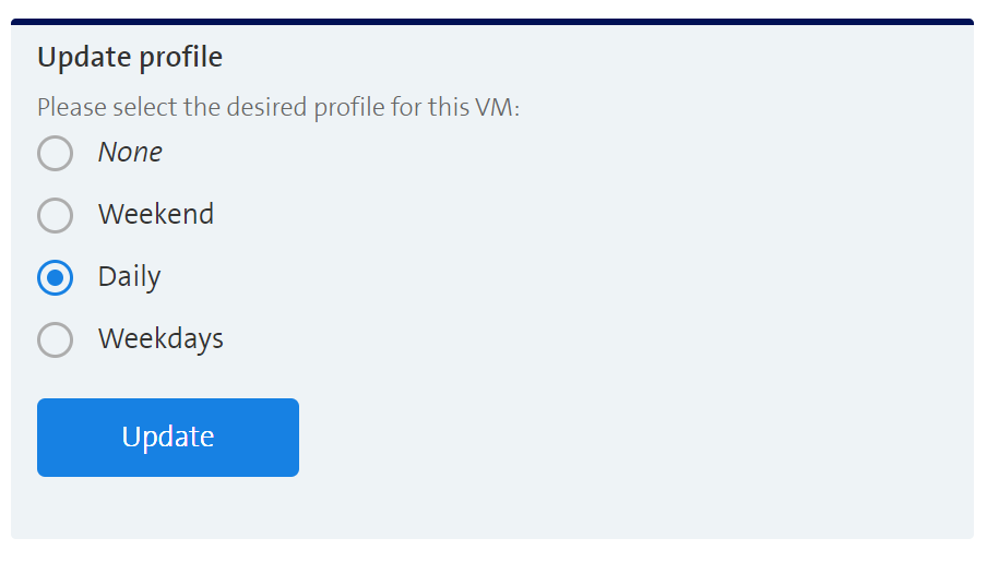 For a VM that has assigned a profile, the next scheduled job for the virtual machine is displayed right next to the form for updating the profile. The information encompasses the command that will be executed (start or stop) as well as the time of execution. In case users do not want the corresponding command to be executed, a button for skipping the job is available as well. The application will then simply reschedule the job that needs to be executed after the skipped one.