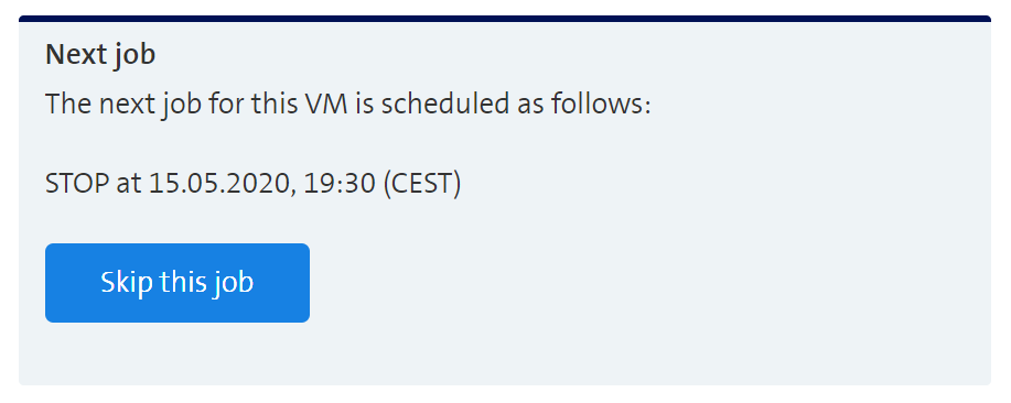 In the example above, the VM will be stopped at the 15th of May at 19:30 CEST. If this job should be skipped, users can simply do the following: