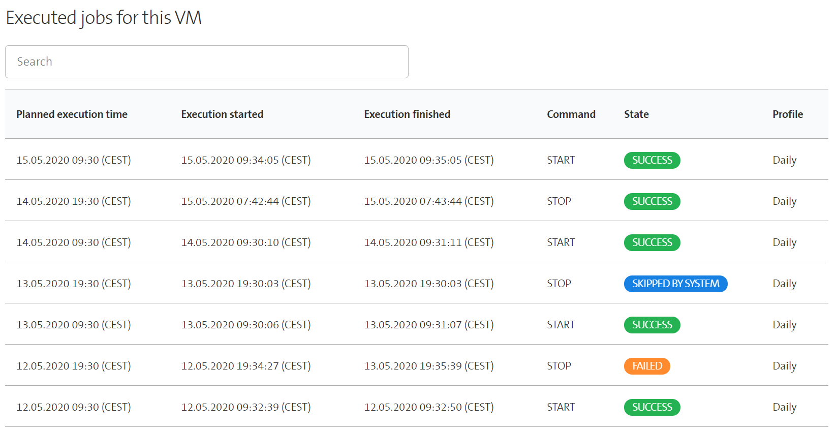 In the evening of the 13th May, the job to stop the VM has the state SKIPPED BY SYSTEM. This state indicates that the corresponding job could not be executed since the virtual machine is already in the right state. In this case, the stop command could not be executed since the VM was already turned off at this time.